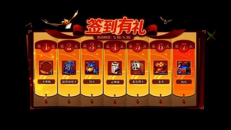5月16日至5月30日,【签到有礼】欢乐开启中!牌友们可以通过每日登录签到获得海量好礼,累签7天更可畅得全部奖励。惊喜道具送不停,五月爽赢牌局!