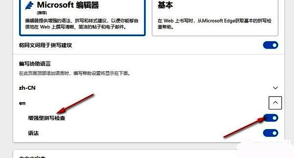 5、最后将“增强型拼写检查”右侧的开关按钮打开就可以了。