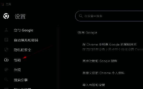 3、进入到“设置”界面之后,点击左侧栏中的“性能”选项。