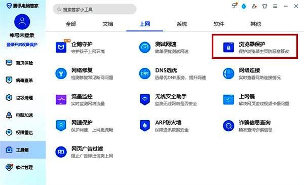 3、在工具箱功能中右侧栏目中选择上网栏目,在其中找到【浏览器保护】进行点击。