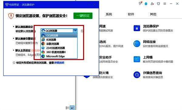 4、浏览器保护页面中在默认浏览器设定中,根据自己的需求来进行浏览器进行选择,然后点击上方的一键锁定。