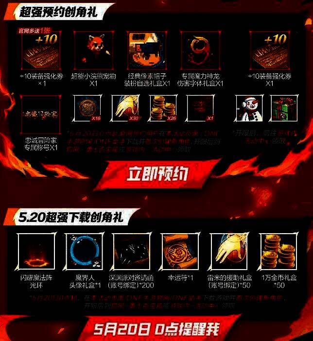 请一定!一定!从5月20日0点起,在DNF手游官网/DNF助手下载游戏并首次创建新角色,开服后到官网-勇士百宝箱或游戏内-活动中心领取。