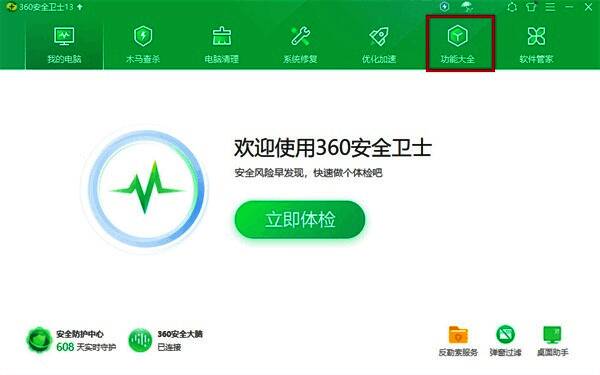 2、360安全卫士首页中点击上方功能栏目中的【功能大全】。