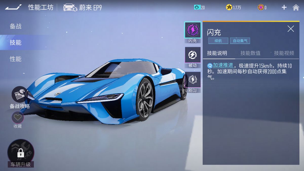 蔚来 EP9开启王牌大招-闪充,加速推进,极速提升15km/h,持续10秒。加速期间每秒自动获得2000点集气。被动特性-可再生能源,每次大招结束后自充能20%。两个技能互相配合,天衣无缝。几乎整场比赛都能保持加速状态,电能全开,真正体会到一跑到底的快感。
