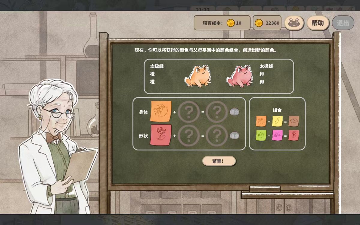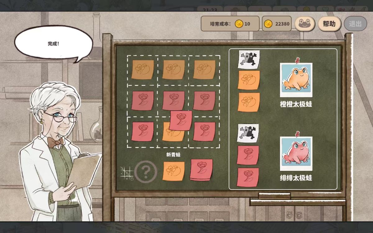 个人感觉下棋的时候还是比较容易弄两个颜色各三连的。然后,可以通过右上边的青蛙图鉴看青蛙的搭配,选出你想繁育的青蛙。