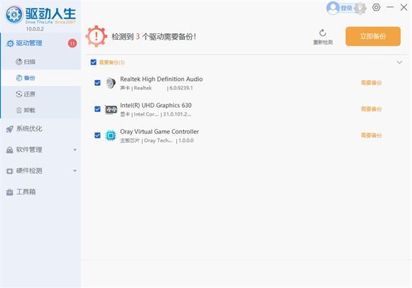 4、检测完成后发现需要备份的驱动资源有哪些,勾选后点击立即备份,等待备份完成即可。