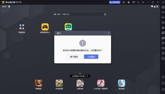 5、保存设置后出现提示,修改后的内容需要重启模拟器才能生效,点击立即重启即可。