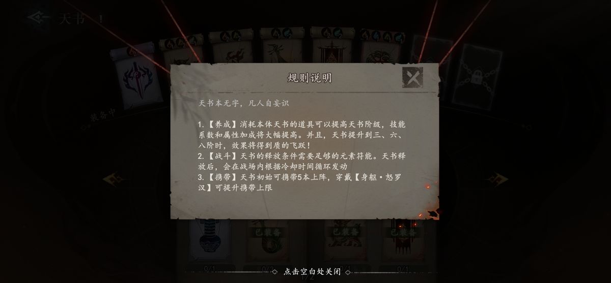 天书的释放条件需要满足足够的元素符文,对应元素符文的个数在天书图标上方有显示,元素符文分为火、水、土、风四种。