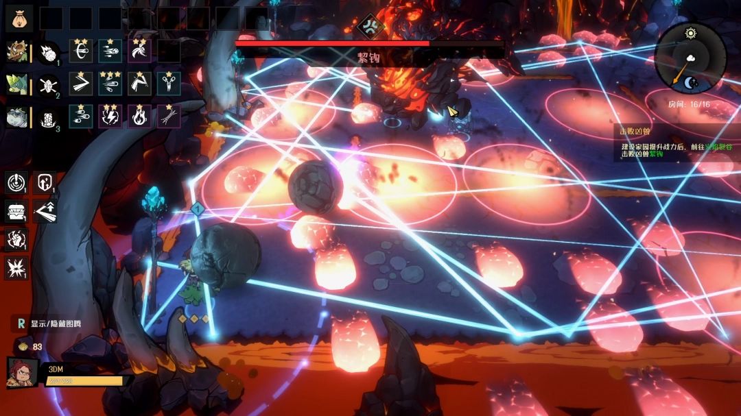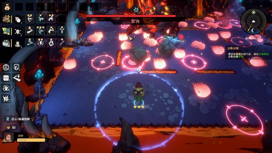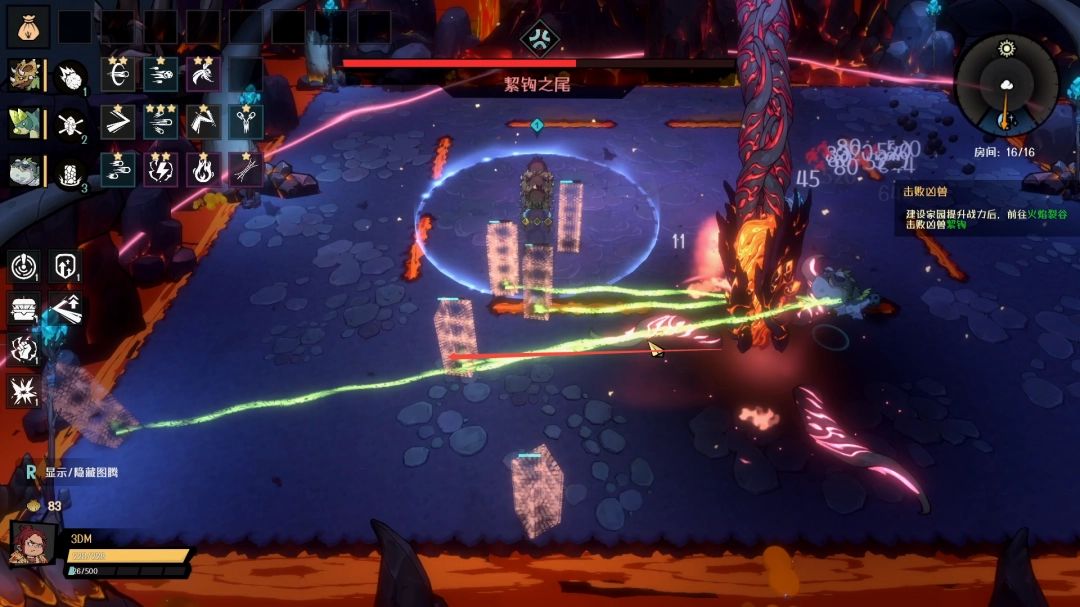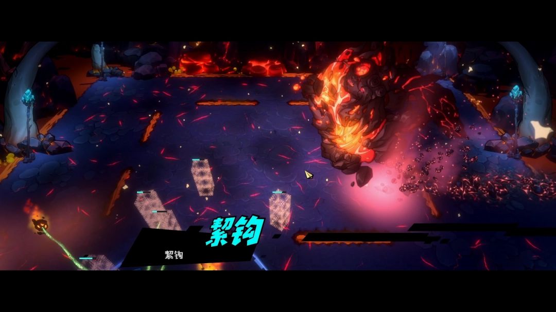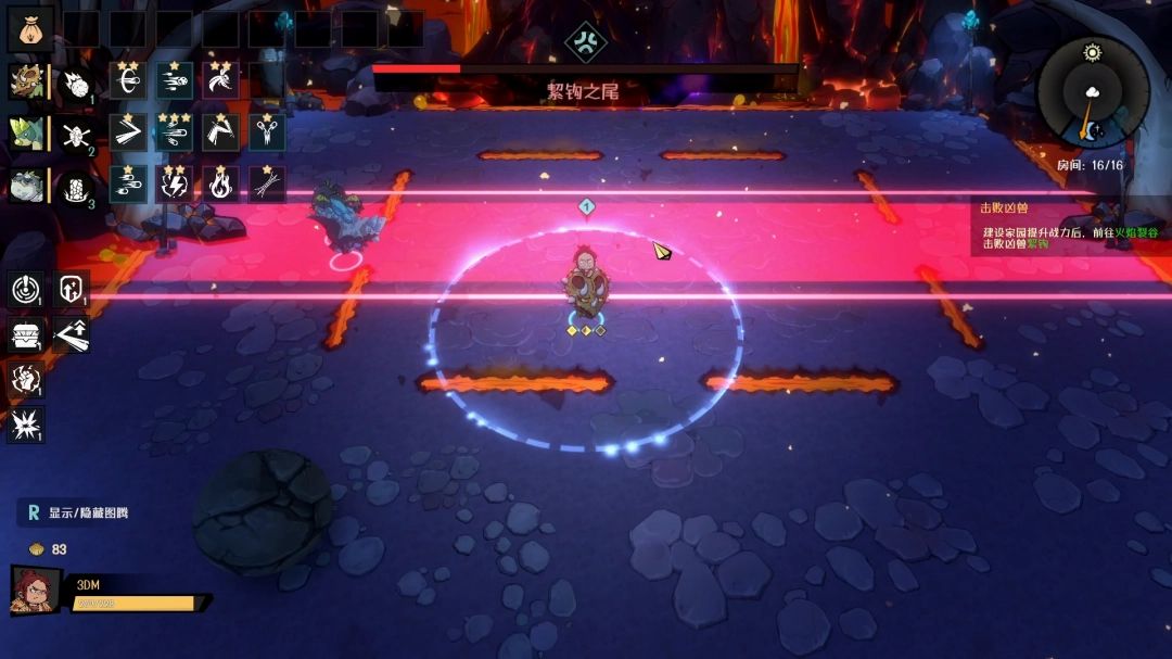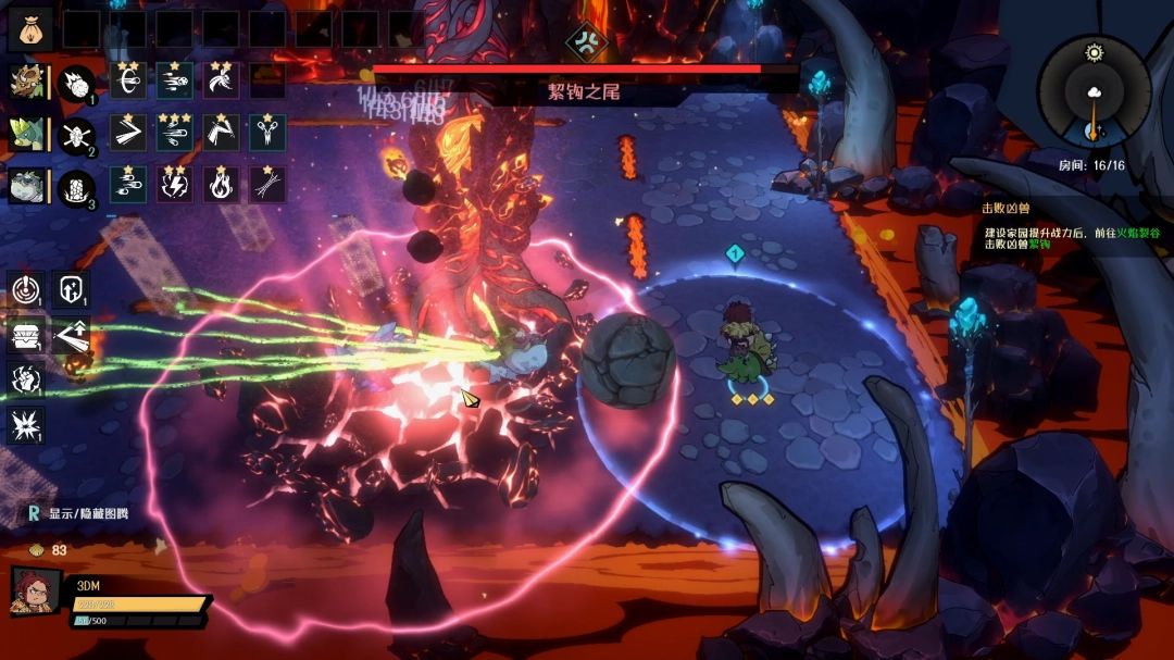 击败它的尾巴后,絜钩本体就会现身,四周从天而降很多的岩浆块,落地之后向四面八方蔓延开来。建议站在角落里面,蔓延出来的岩浆移速很慢,站在角落可以更好的观察走向。