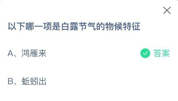 以下哪一项是白露节气的物候特征?这是9月7日蚂蚁庄园的小鸡课堂题目哦,支付宝里这个小鸡答题超受欢迎的!只要攒够饲料喂小鸡,就能收获更多鸡蛋,一起为公益助力啦!今日正确答案是【鸿雁来】,鸿雁南飞,元鸟北归,群鸟储食,此乃白露节气特有的物候景象。随着气温逐渐下降,天气转凉,温度变化成为主导物候现象的关键因素。为应对寒冷、适应环境变迁,鸟类纷纷采取相应行为,或迁徙以避寒,或储备食物以度凉季,展现出与自然节律相协调的生命智慧。