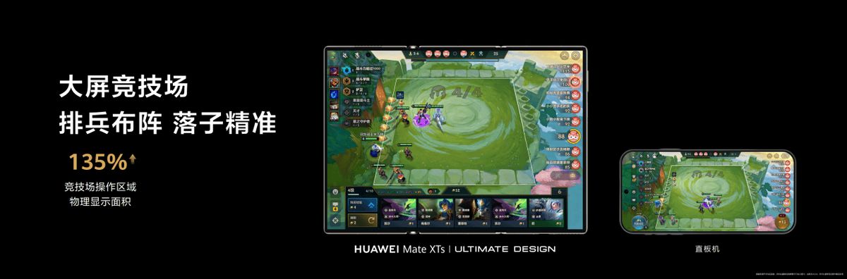 据腾讯互动娱乐K6合作部社区生态业务负责人蔡俊介绍,华为Mate XTs非凡大师独特的超宽屏设计为《金铲铲之战》带来了极强的视觉优势:大屏竞技场,竞技场操作区域物理显示面积提升135%,排兵布阵落子精准,动效提示与破框特写也清晰醒目;3K大屏显示,沉浸体验细节更有料,玩家能够清晰洞察战场动态与对手意图;大屏无遮挡,边搜边战,从容制定策略;大屏悬浮窗,边学边弈,一屏搞定,将策略博弈体验提升至全新高度。