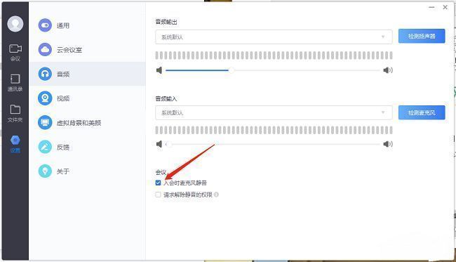 3、然后找到右侧"会议"一栏中的"入会时麦克风静音",最后将其小方框勾选上就可以了。