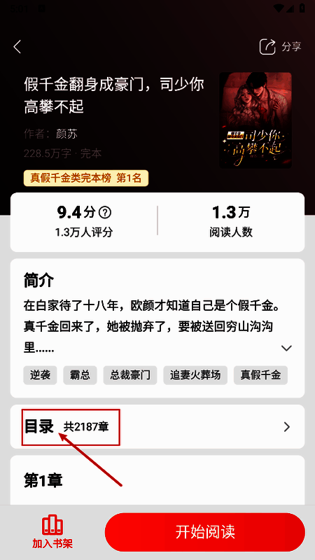 2、进入小说详情页,点击"目录"。