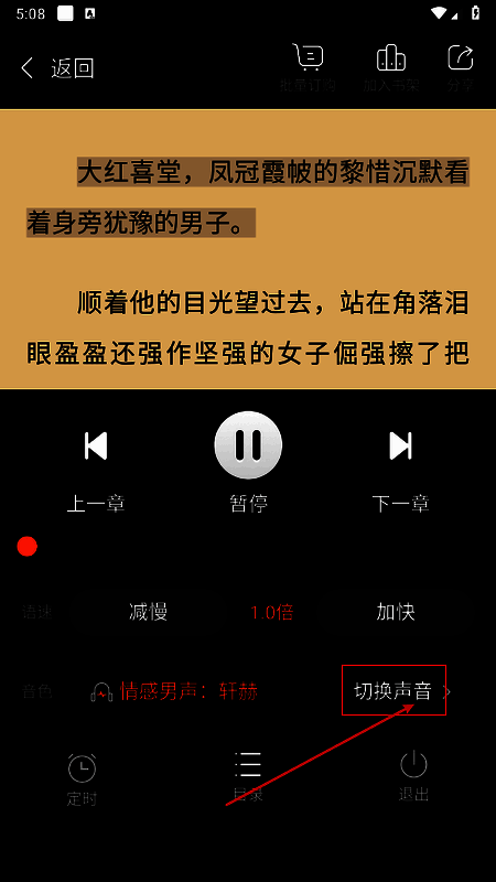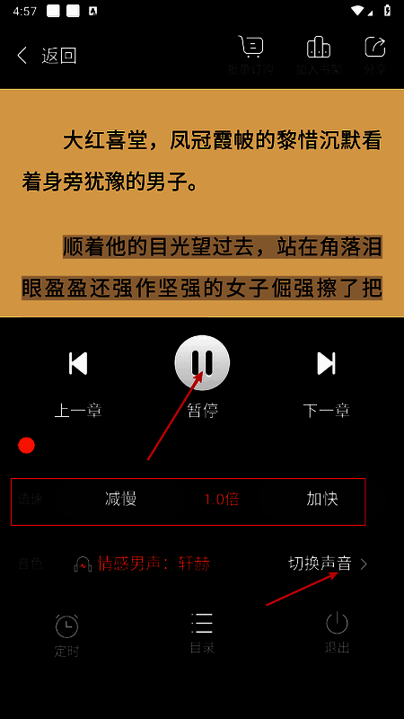 5、进入后即可免费开启听书了,还可以进行调整语速、定时等。