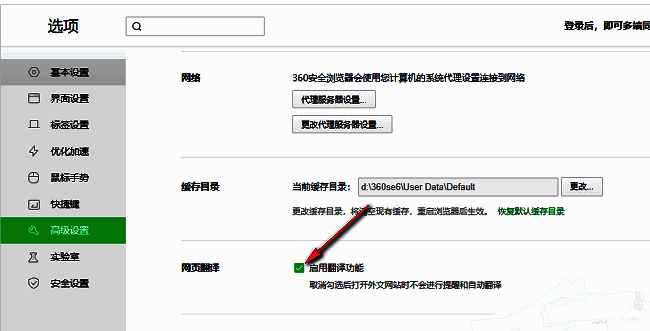 4、然后找到右侧"网页翻译"一栏中"启用翻译功能",并将其小方框勾选上。