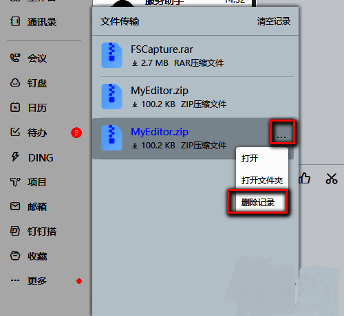3、然后就可以在列表中查看到传输过的文件,选择想要删除的文件,点击其右侧的三个点"..."按钮,选择下方选项列表中的"删除记录"。