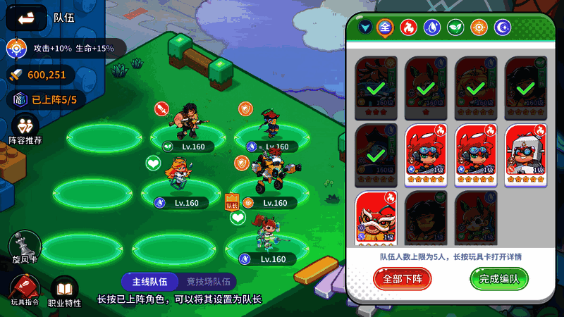 前期可以使用主角+莉莉丝+约翰兰博+其他水系或草系玩具,尽量多开羁绊,能够获取属性加成。