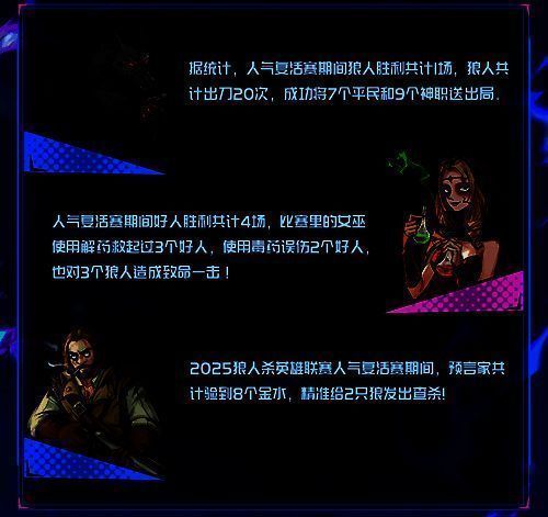 在本次人气复活赛中,狼人阵营仅拿下一场胜利,好人阵营则取得了4场胜利,好人阵营胜率整体远高于狼人阵营,但狼人成功出刀20次并将7个平民和9个神职送出局,预言家则是成功给两名狼人发出金水。