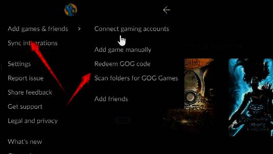 1、双击打开软件,点击左上角的齿轮图标,接着点击下方选项列表中的"Add games&friends",再点击其中的"redeem gog code"。