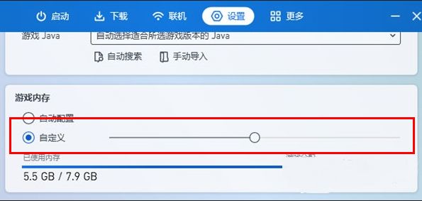 3、然后将右侧中的"游戏内存"选择为"自定义",并根据需求拖动滑块设置合适的内存大小。