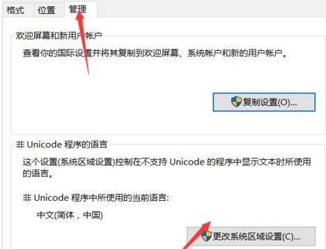 5、在给出的窗口中,点击上方中的"管理"选项卡,并点击下方中的"更改系统区域设置"按钮。