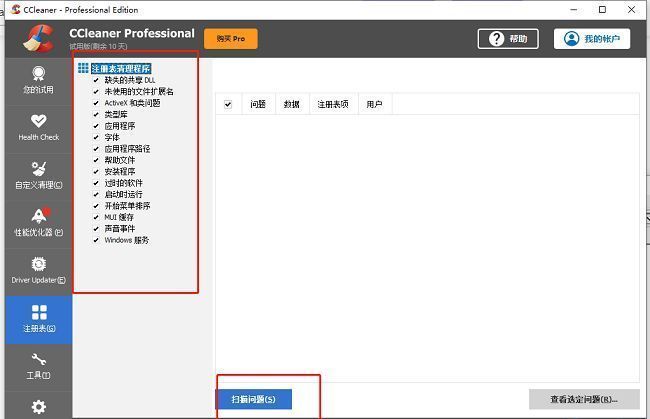 2、接着在右侧中勾选需要进行清理的注册表,并点击下方中的"扫描问题"按钮。