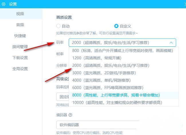 3、接着点击"码率"选项框下拉按钮,选择一个合适的数值。
