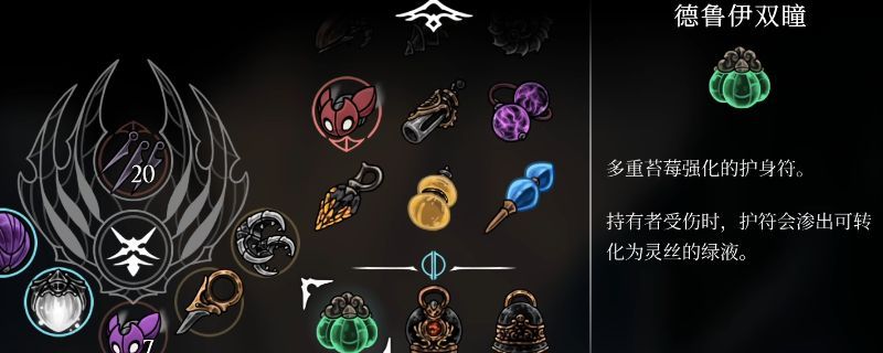 《空洞骑士:丝之歌》中的道具可以大致分为蓝色道具和红色道具,而蓝色道具的效果和获得方法各不相同,首先是德鲁伊双瞳,多重苔莓强化的护身符。持有者受伤时,护符会渗出可转化为灵丝的绿液。