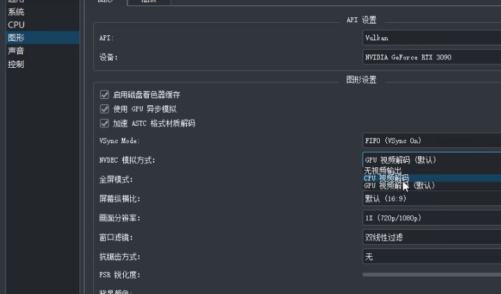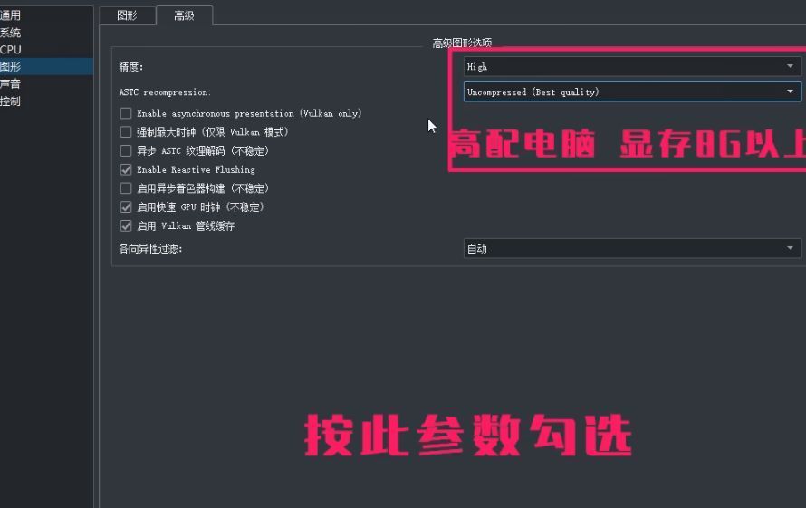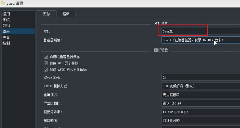8、图形设置中,API选项默认为Vulkan,如果游戏中遇到黑屏问题,可以设置为OpenGL选项,没有黑屏就使用最快的Vulkan模式。