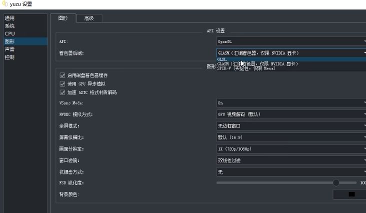 9、图形设置中,着色器后端选择,GLASM(汇编着色器,仅限NVIDIA显卡),如果是a卡就选择GLSL模式。