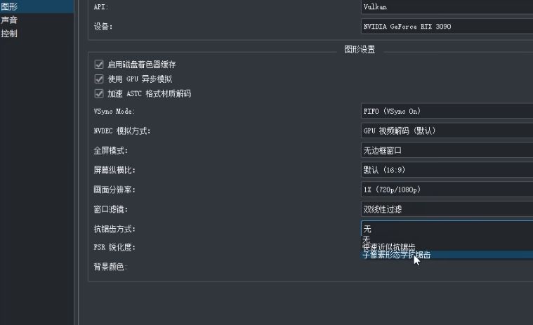 12、图形设置中,抗锯齿方式,一般配置选择无,高配选择子像素形态学抗锯齿。