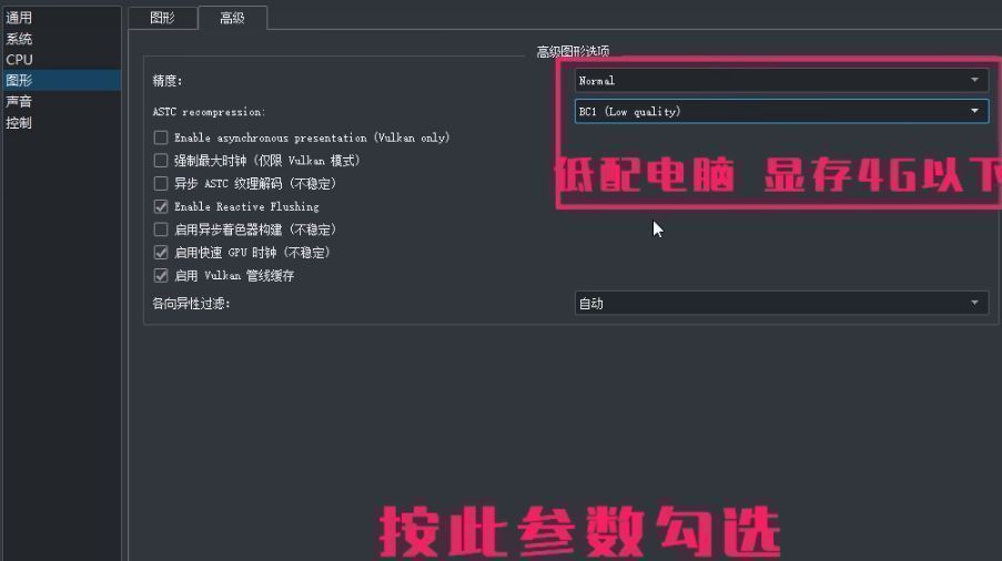 低配电脑显存4g以下选择:精度:Normal。ASTC:选择BC1(Low quality)。