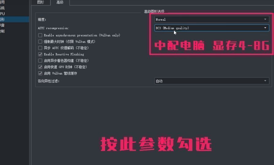 中配的显存4g-8g选择:精度:Normal。ASTC:选择BC3(Low quality)。