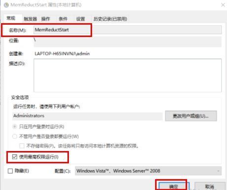 3、接着输入任务的名称,并将"使用最高权限运行"小方框勾选上,点击"确定"。