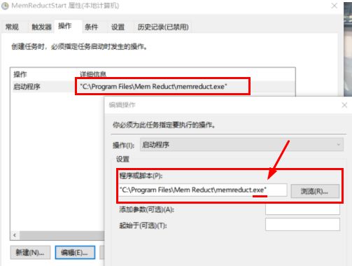 5、点击上方中的"操作"选项卡,点击路径,再点击"浏览"按钮,选择"memreduct.exe",点击"确定"。
