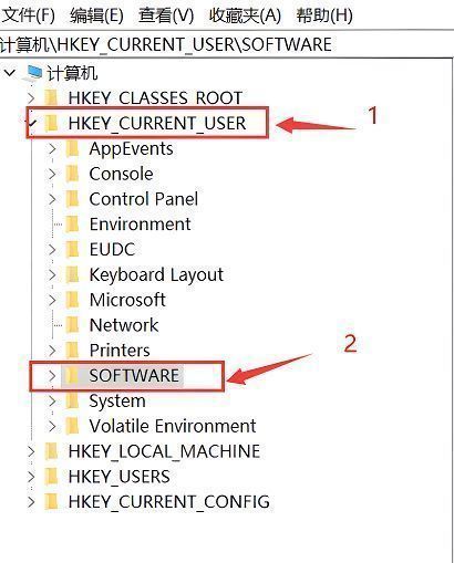 2、进入到新的窗口界面后,点击左侧"HKEY_CURRENT_USER——SOFTWRE"。