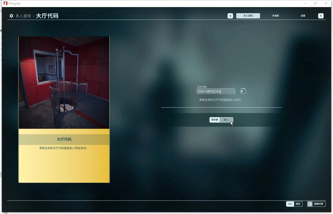 加主机:多人游戏——大厅代码——输入大厅代码加入。