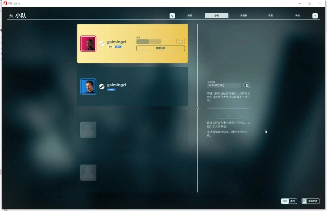 建主机:多人游戏——主机房间——创建服务器——按Esc,小队,把大厅代码告诉别人——一边玩一边等人。