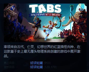 《全面憨憨战争模拟器》(又名:TABS全面战争模拟器)是一款画风搞怪、拥有独特物理引擎的战争模拟游戏,先前PC版在Steam上累计已经获得了97%好评率。