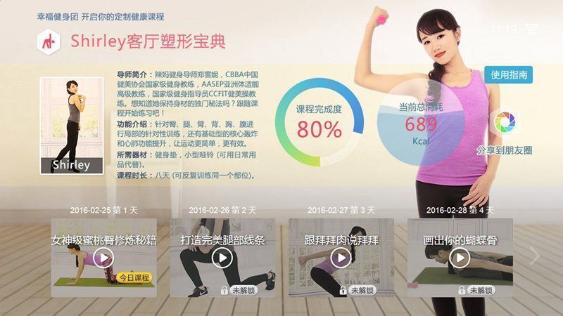 在最新v4.4.2版本中,《幸福健身团 TV版》带来了全新的UI界面设计,更加简洁清爽;课程内容也进行了优化,训练计划更量化、更科学;同时还新增了私人教练服务,用户可享受一对一的专业指导,包括饮食搭配和训练计划制定,真正实现家庭式健康管理。