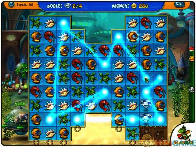 在《鱼之王国:时间深处》中,只要将3个相同的物体连载一起即可完成消除,随着游戏进行,通关的条件也不同,有需要清楚障碍的,也有让钻石落到最下面的,同时各种障碍也会越来越多。