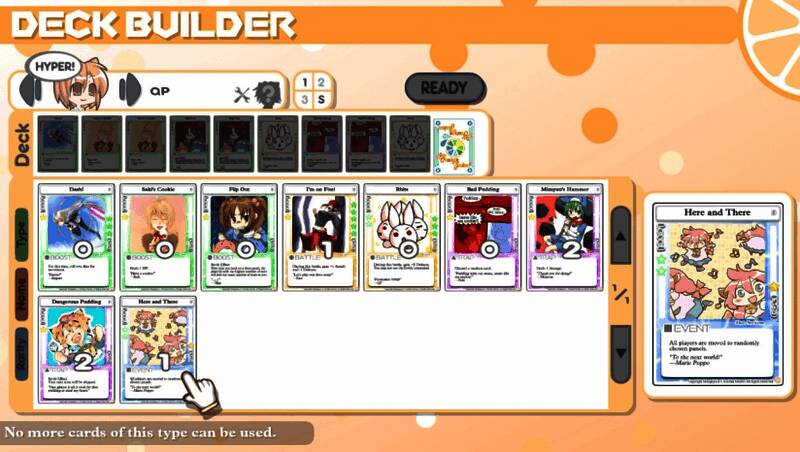 游戏开始前,玩家需要选择十张卡片组成一副牌。游戏中有50多种卡牌,包括增益自己,扰乱对手,改变地形等效果。