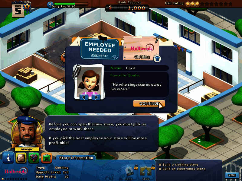 可玩性:游戏中包括8个主题场景,每个章节具有4个挑战关卡和一个奖励关卡,完成全部将获得荣誉奖杯。玩家可以建造服装、玩具、书籍等6大类18个不同的商店,以及餐厅、银行等辅助商城设施,聘请销售、清洁、维修员和保安,修建喷泉、购买盆景等环境装饰。此款游戏会带给你上瘾的游戏乐趣。