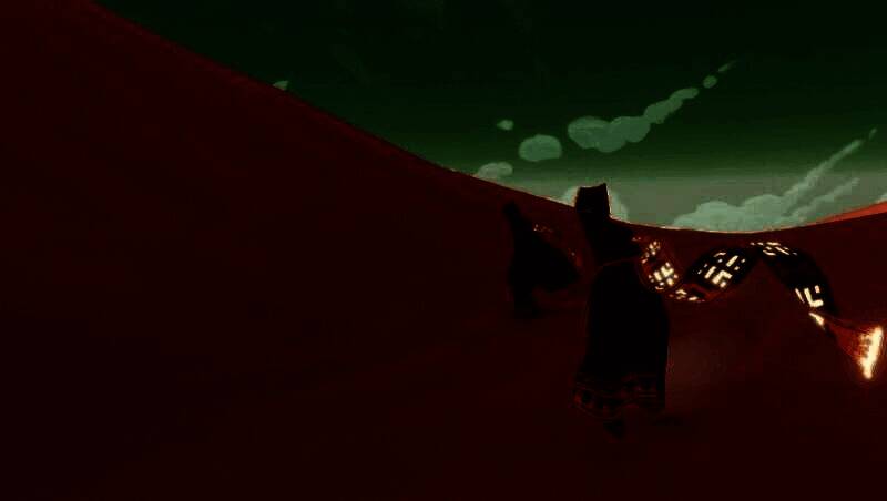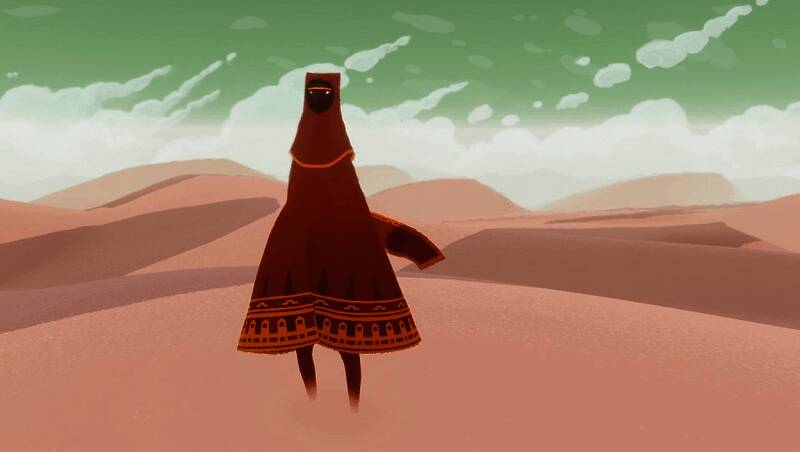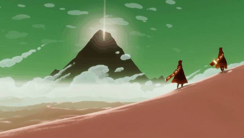 身着兜帽长袍茕茕孑立的寂寞旅人自沙漠中醒来,唯一的目标便是远方的山。在那座山上有一道光,直通天际。旅者认为那里是圣人的所在地,为了朝圣踏上了未知的旅途。当《风之旅人》的玩家最终一步步迈向终点时,主角的行动会逐渐迟缓,直至躯体倒在雪地中,而此时,众神出现,召唤他并使他复活,新的旅途也由此开始。