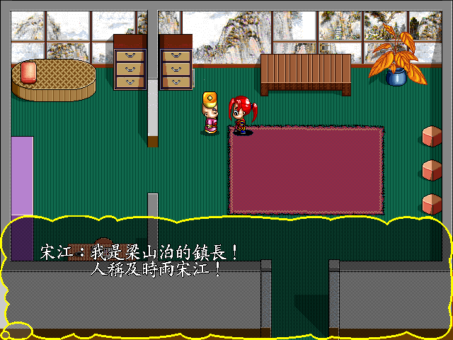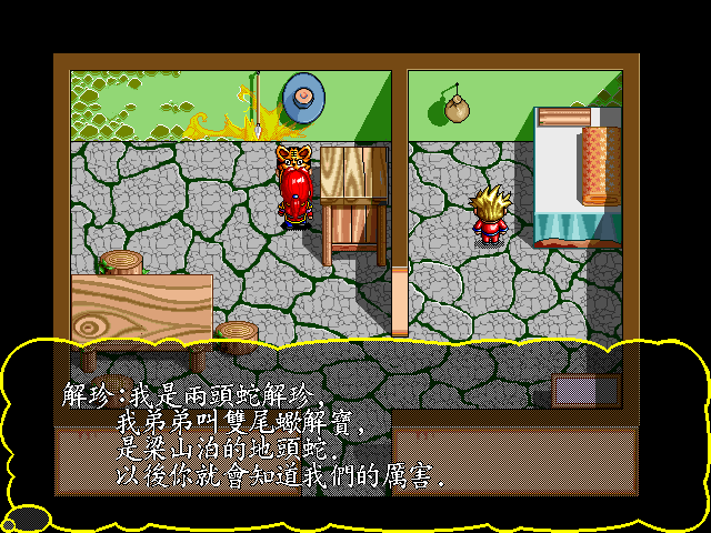 这是一款天堂鸟旗下的西塔工作室98年出品的RPG游戏。游戏容量1CD,游戏平台Win 95和DOS。这个游戏表面上是拿《水浒传》做底,但实际上已经是改得面目全非,变得爆笑满堂。游戏中只是用了《水浒传》的人物名称,游戏故事讲的是男主角因为杀了高俅的儿子,害得父亲丢了官,被捉进府里。