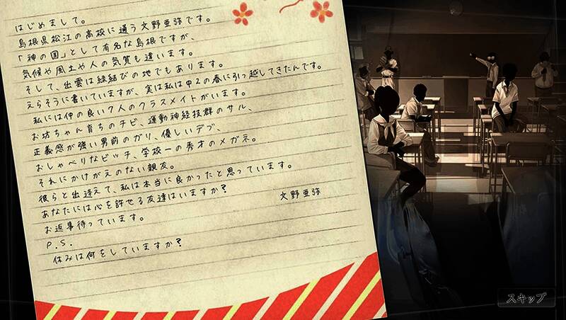 没有犹豫,Takayuki去了Aya居住的小镇Shimane,以找出真相。然而,他唯一看到的是一个空地,一个被烧毁的房子。他询问的第一个人说,Aya Fumino在25年前去世,而不是15岁。那么,他的笔友实际上是鬼吗?还是人们说谎隐藏一些可怕的秘密?