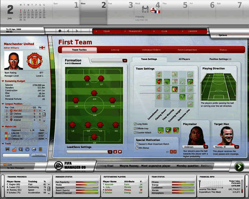 FIFA Manager 09包含了全新的阵容和战术——都很方便易用而又增加了可操作的深度。前作当中诸如铲球、前插、传球方式、传中位置、传中频率……以及指定队长、罚球手、组织核心等功能都将完全保留。总之玩家在繁多的战术组合当中找出一套最适合自己的打法,如果这样还无法确保胜利,别忘了还可以增加赢球奖金或者将这场比赛定义为“本赛季的关键之战”!