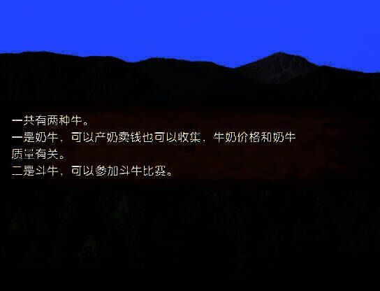 每天都必须和牛说话,不然他们的心情会不好。时间久了就会因此生病。生病久了不治疗就会死亡。牛死了你就输了,一只也不可以死哦,他们可是你的朋友。宠物也不可以死。关于斗牛,说话后可以选择对他做的事情。做的事情不同,会对他的成长有不同的偏向,你在斗牛时就会发现自己的牛这么培养到底对不对了。而斗牛是在牧场的下方。左右有邻友牧场,可以与他们交朋友。宠物间可以进行宠物竞赛,十分有趣。另有木匠可以改建房屋。游戏中根据天数本身内含一些剧情,不会让你觉得每天都是一样而造成乏味。其他就自己探索吧