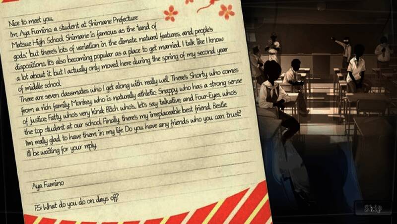 游戏主人公贵之在整理房间时,偶然发现了十五年前笔友文野亚弥的信件,其中有一封未开封且没有邮戳的信,信中亚弥称自己杀了人,需要赎罪,并与贵之告别。在打听之后,贵之才知道文野家因为十五年前的火灾已经不存在了。于是,贵之踏上了前往岛根县的旅程,试图寻找真相。