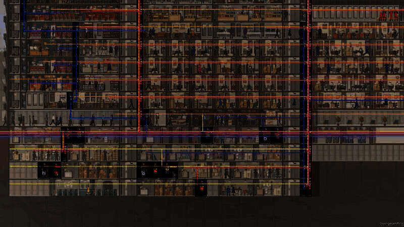 比方说,在房客搬进来之前,玩家需要先安排好一间新房屋,还要布好水电,还得连好电话线、电线和天然气管道。有时候玩家还得去地下增设配电箱、变压器、收发器、水表和天然气支管来增加可供给的住户数量,而且大厦每一层还需要建造新的设备间。技术上讲,这不费什么工夫:简单点一下打开设备图层,然后拖拽几下鼠标在房间周围布好不同颜色的管道和电线就可以了。
